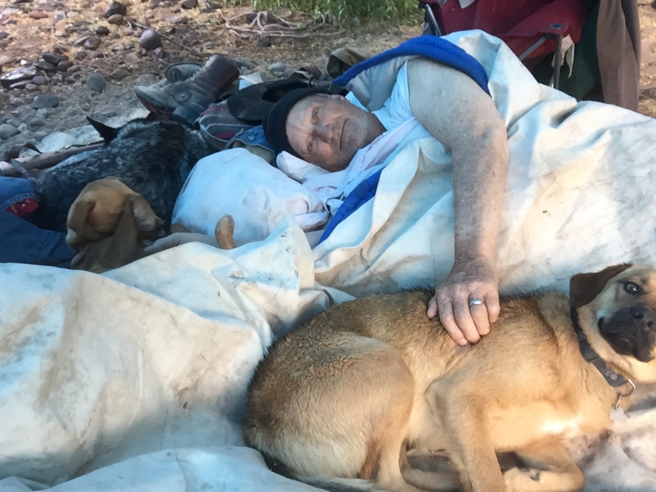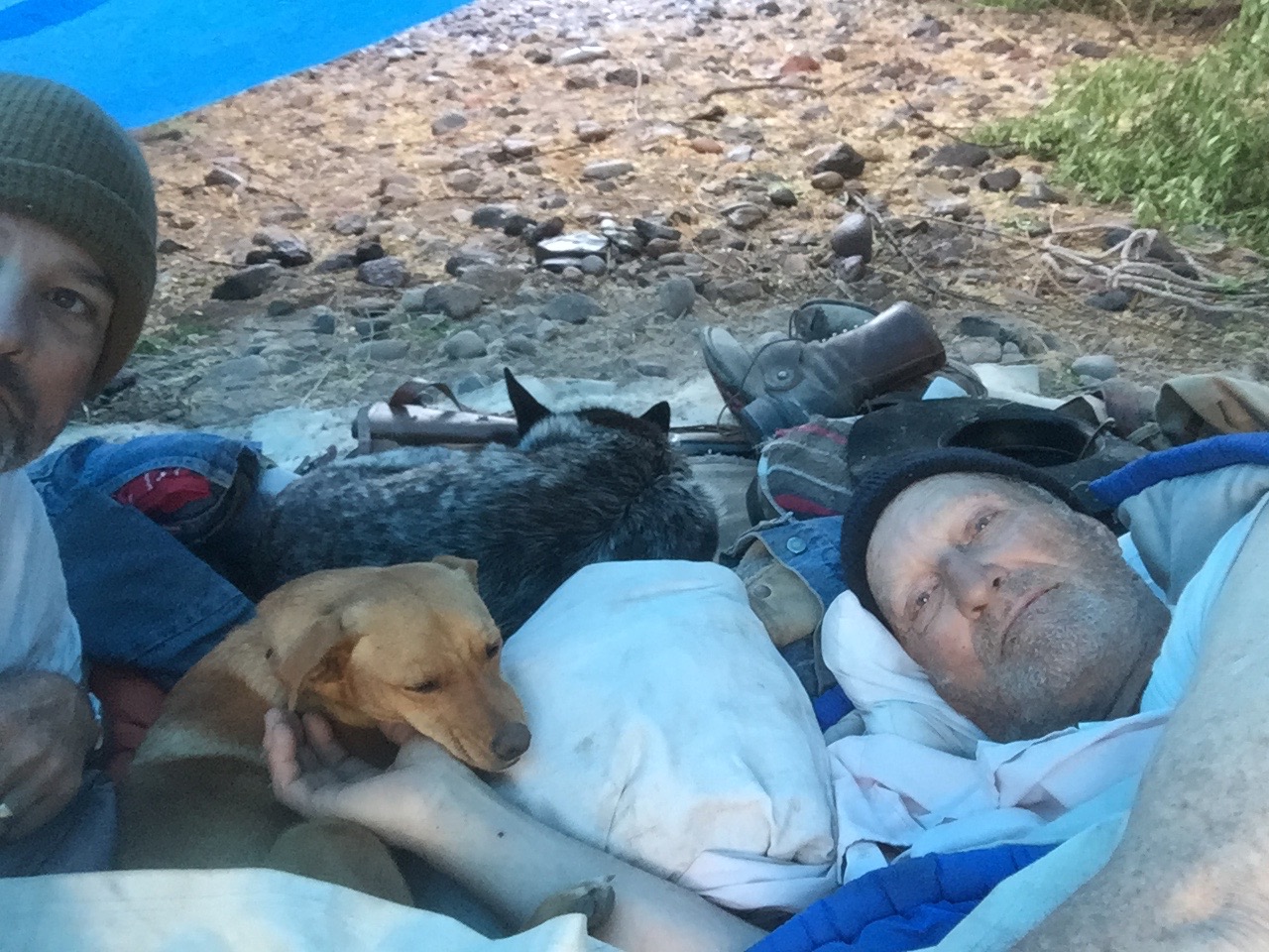 Dad and me with our new camp companions. These two dogs spent a wet, cold night with us. It was lucky they did, because later I needed the